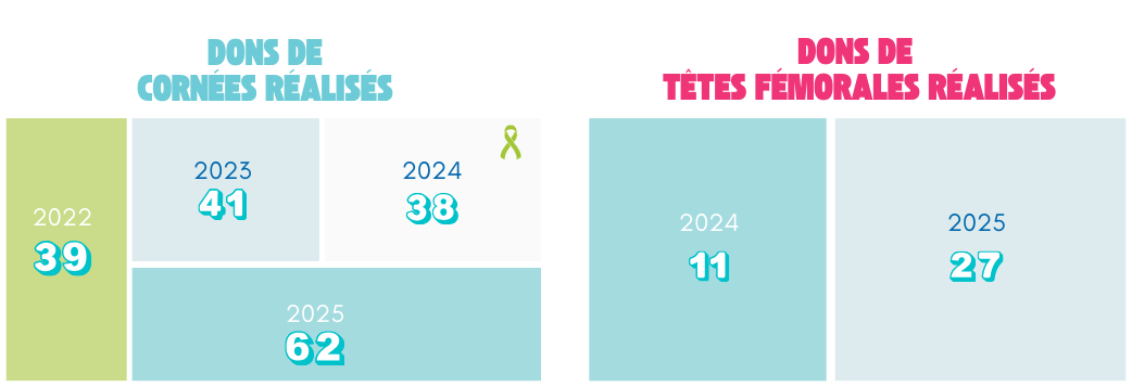 En 2022, 39 dons de cornées ont été réalisés. Cette activité est en constante progression : 41 dons en 2023, 38 en 2024 et 62 en 2025.